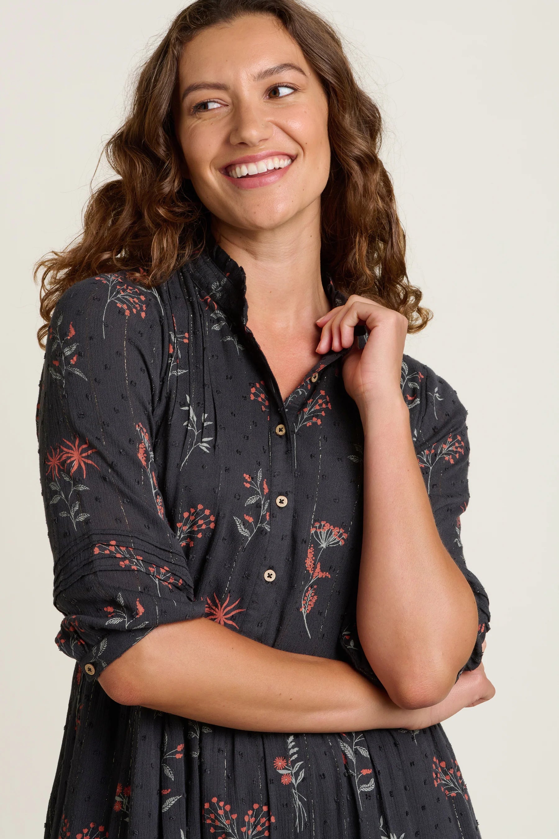 The Bella Dress brings easy-going folk glamour to the everyday. Delicately balancing floaty with form fitted, this day dress features a half-button up and long sleeves with a tiered and knee-length skirt. The moody botanical print has a subtle metallic thread woven through it that catches the light too. Wear with a cord shacket or denim skirt and boots for relaxed evenings out or weekend brunches with friends.