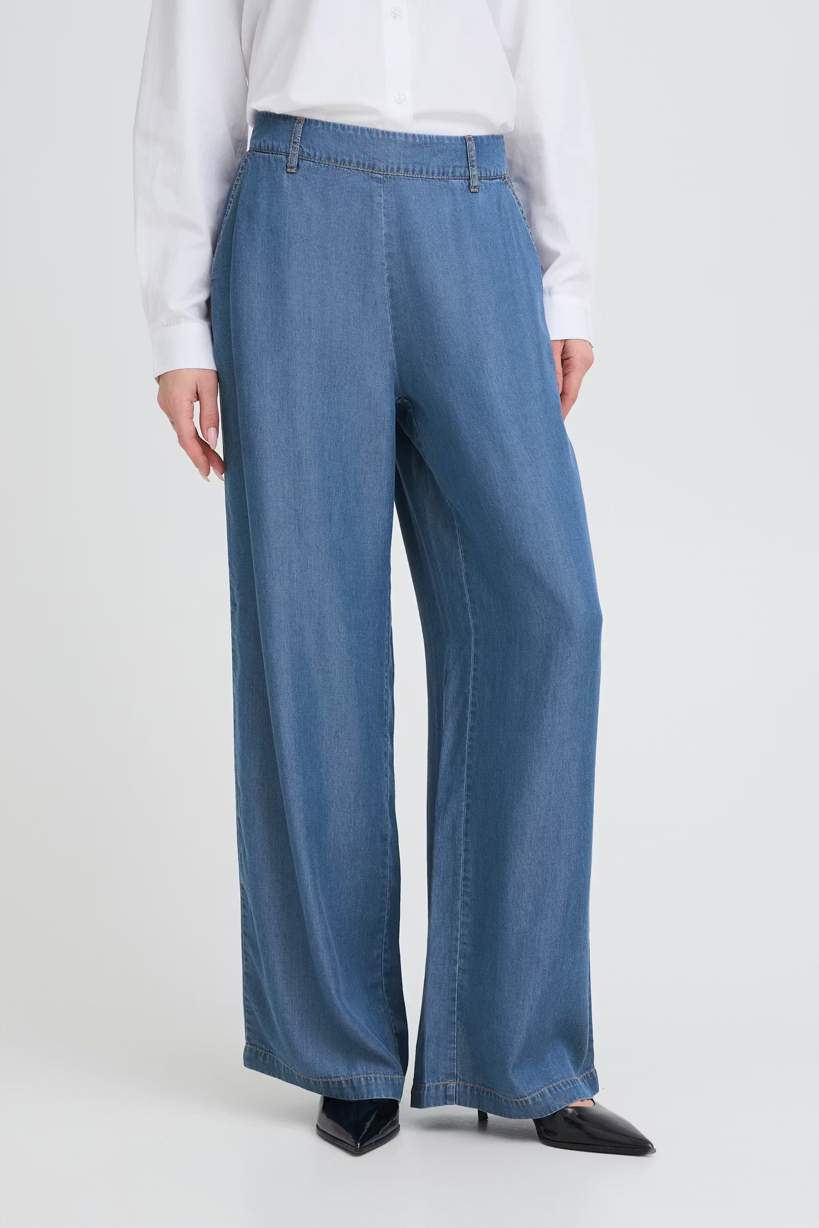 Wide-leg jeans feature a relaxed silhouette with a high elasticated waistband and belt loops. Full-length cut and soft denim texture deliver a comfortable fit. The jeans have a minimal design with clean lines and no visible hardware.
