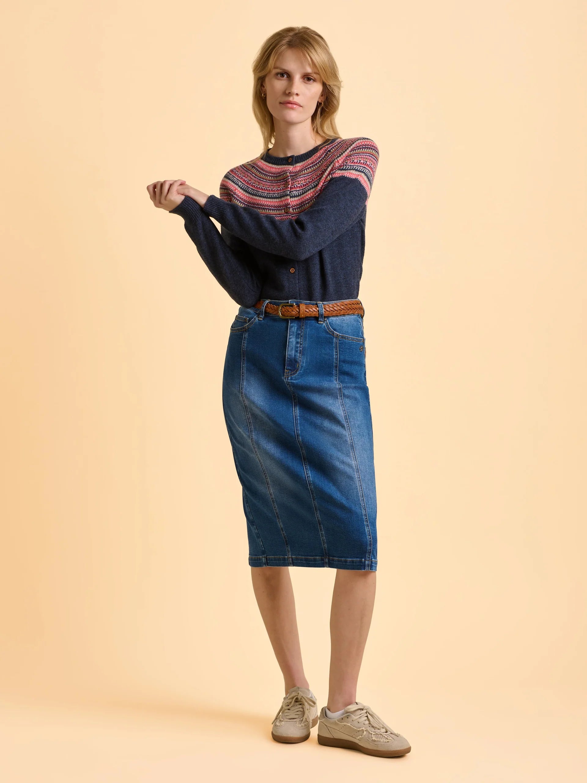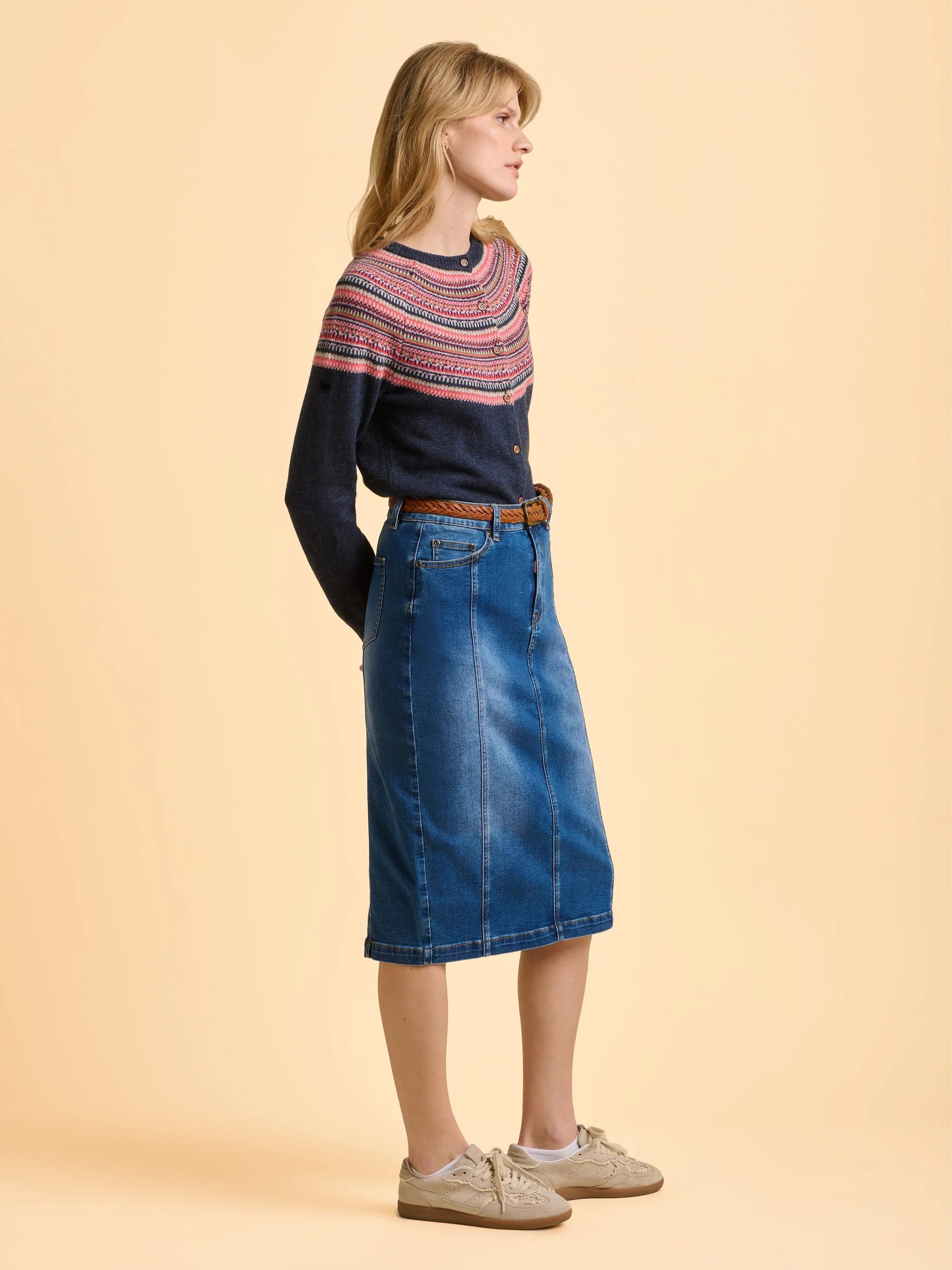 Our Deepwater Cardigan brings seasonal charm with its vibrant pattern in pinks and blues against a rich navy background. Lightweight and made with 52% wool, it’s perfect for layering. Featuring wooden buttons and neat ribbed cuffs and hem for a polished finish, it pairs perfectly with pink wide-leg trousers.