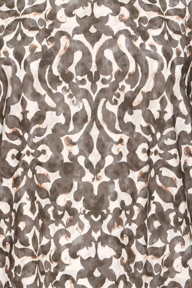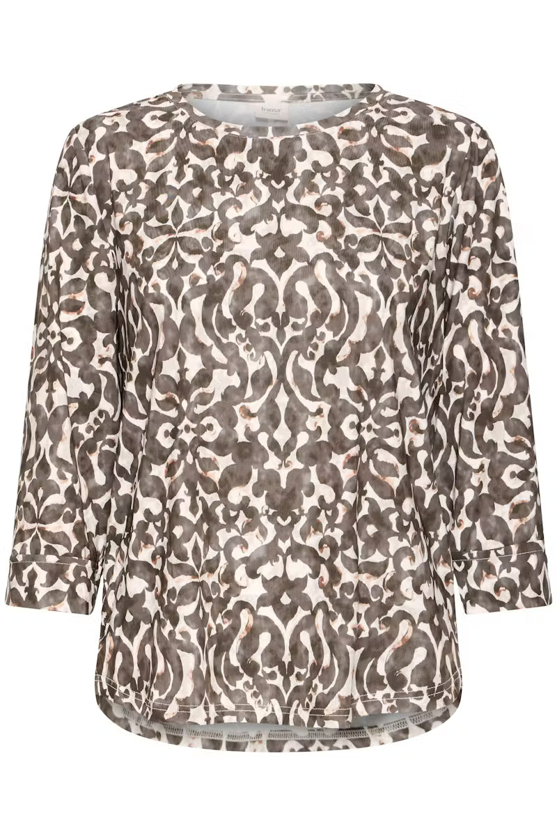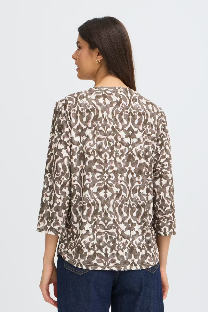 Patterned top with a straight silhouette, round neckline, and 3/4 sleeves. Features an allover print and slight high-low hem for a modern touch.