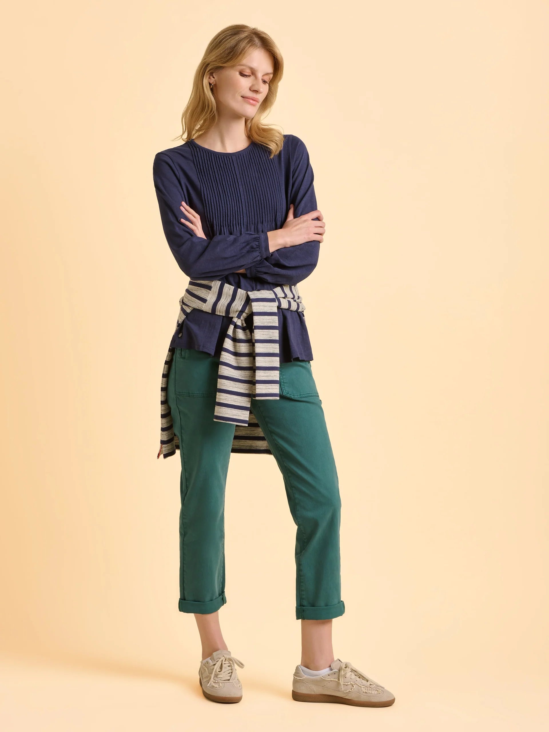 A fresh take on a wardrobe staple, this 100% cotton jersey top features cuffed sleeves with gentle gathers, a curved neckline, and neat pleats down the front. Lightweight and easy, it’s the perfect basic with a subtle, elevated twist. Style with cream wide leg jeans and comfortable trainers.