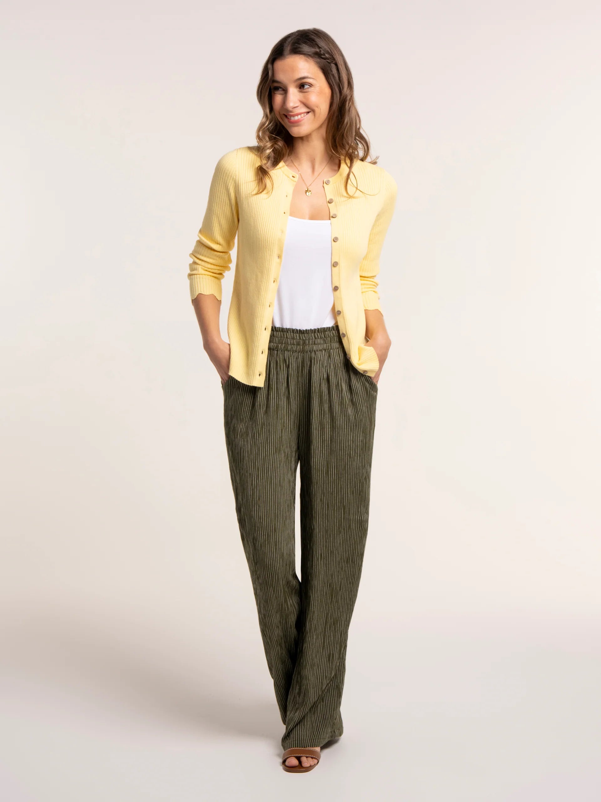 Our Rayna Rib Stitch Cardigan is designed to see you through the season and beyond. The rib stitch gives it great stretch while keeping a slim, flattering fit. Finished with delicate scalloped cuffs and dyed in a soft butter-yellow shade, it’s an easy layer that works for everyday wear and more dressed-up moments